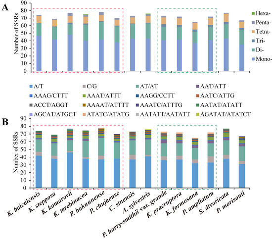 Comparison of simple sequence repeats (SSRs) in the 14 plastomes of Kitagawia and related taxa. (A) number of six types of SSRs; (B) number of all repeat motifs of identified SSRs. Boxes in pink and green are for Subclade I and Subclade II, respectively.