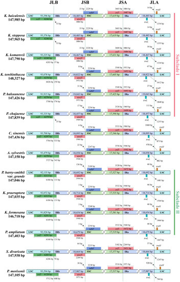 Comparison of the border regions of the 14 plastomes of Kitagawia and related taxa. Different boxes for genes represent the gene position.
