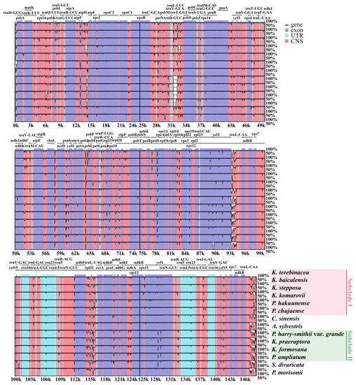Sequence identity plot of the 14 plastomes with K. terebinthacea as the reference. The vertical scale represents the percentage of identity ranging from 50 to 100%. Coding and non-coding regions are marked in purple and pink, respectively.