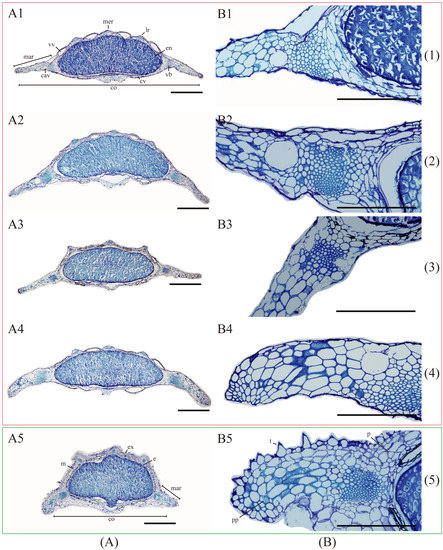 Fruit anatomical characteristics of five Kitagawia species. (A) transverse sections; (B) mesocarp parenchyma in marginal ribs. (1) K. baicalensis; (2) K. stepposa; (3) K. komarovii; (4) K. terebinthacea; (5) K. praeruptora. Abbreviations: cav = cavity; co = commissure; cv = commissural vittae; e = endocarp; en = endosperm; ex = exocarp; lr = lateral ribs; m = mesocarp; mar = marginal ribs; mer = median rib; p = parenchyma without pits; pp = lignified parenchyma with pitted walls; t = trichomes; vb = vallecular bundles; vv = vallecular vittae. Boxes in pink and green are for Subclade I and Subclade II, respectively. Scale bar = 0.5 mm in (A); 0.25 mm in (B).