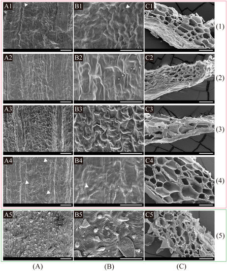 Fruit micromorphological characteristics of five Kitagawia species. (A) surface patterns of fruits; (B) cuticular foldings of fruit surfaces; (C) inner structure in marginal ribs of fruits. (1) K. baicalensis; (2) K. stepposa; (3) K. komarovii; (4) K. terebinthacea; (5) K. praeruptora. Rugulate cuticles are marked with white triangles. Boxes in pink and green are for Subclade I and Subclade II, respectively. Scale bar = 100 µm in (A); 50 µm in (B,C).