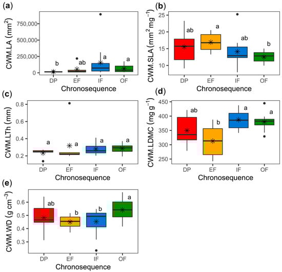 Community-weighted means (CWMs) of plant traits for the different successional categories (DP, degraded pasture; EF, early forest; IF, intermediate forest; OF, old-growth forest or mature forest); (a) LA, leaf area; (b) SLA, specific leaf area; (c) LTh, leaf thickness; (d) LDMC, leaf dry matter content; (e) WD, wood density. Asterisk (*) represent mean values. The upper and lower whiskers represent the maximum and minimum values established at the third (+1.5 IQR) and first quartile position (−1.5 IQR), respectively. For each trait, values between successional categories followed by the same letter do not differ statistically according to Fisher’s LSD post hoc test (p < 0.05).