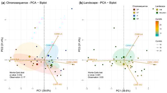 Principal component analysis (PCA) with the community-weighted means (CWMs) of plant traits and the sampling plots projected on the ordination plane PC1/PC2. The color of the vectors indicates the contribution of the variables to the PCs; 95% confidence ellipses. (a,b) Sampling plots grouped by chronosequence (DP, degraded pasture; EF, early forest; IF, intermediate forest; OF, old-growth forest or mature forest) and landscape (hill and mountain), respectively.