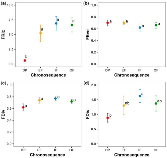 Means ± SE for: (a) functional richness (FRic), (b) functional evenness (FEve), (c) functional divergence (FDiv), and (d) functional dispersion (FDis) for the different successional categories (DP, degraded pasture; EF, early forest; IF, intermediate forest; OF, old-growth forest or mature forest). For each index, values between successional categories followed by the same letter do not differ statistically according to Fisher’s LSD post hoc test (p < 0.05).