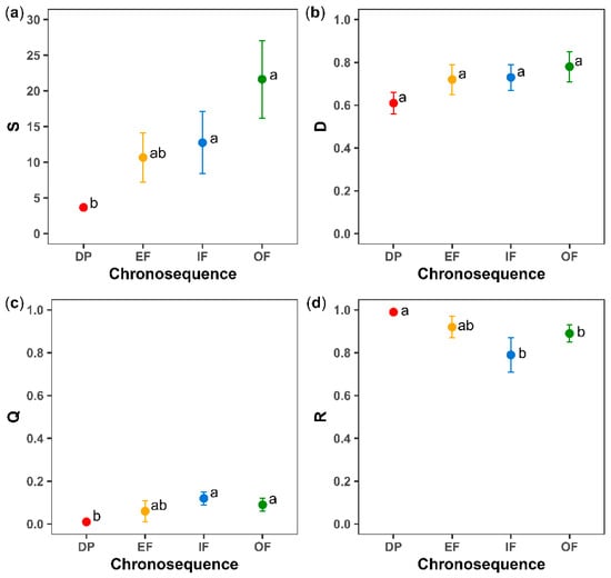 Overall, the S, D and Q indices tended to increase along the successional gradient (Figure 4a–c), while R tended to decrease as the succession progressed (Figure 4d). Thus, S an Q were significantly higher in the IF and OF categories than in DP (p < 0.05), contrary to that observed in R.