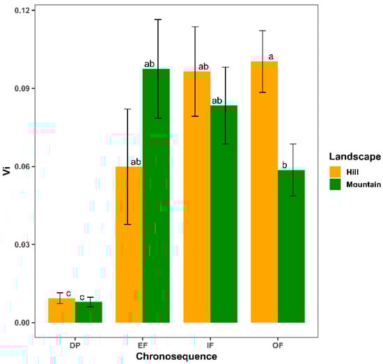 On the other hand, in both landscapes, a higher species-level vulnerability (Vi) was evidenced in the EF, IF and OF categories than in DP (p < 0.05; Figure 5. OF had a significantly higher Vi in the hill than in the mountain (p < 0.05).
