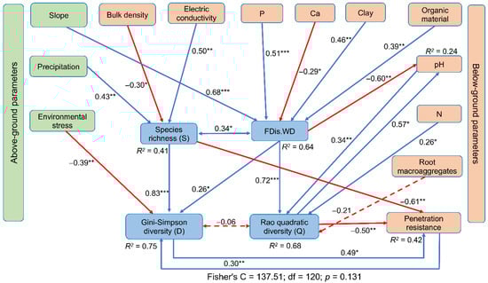 For the below-ground parameters (i.e., soil properties), the SEM showed that bulk density and electric conductivity (CE) had a negative and positive effect on S, respectively, which led to an increase in D. Furthermore, an increase in the penetration resistance increased D. On the other hand, when the P, clay and organic material contents increased, the FDis.WD became higher; consequently, the higher FDis.WD had a positive effect on Q. In addition, when the pH and N values increased, Q became higher.