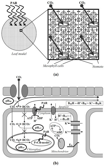 A general scheme of the developed two-dimensional model (a) and main processes described by the model on the cell level (b). Model elements (squares) include both mesophyll cells and stomata or only mesophyll cells (without stomata). Small arrows in the general scheme show transport of carbon dioxide, H+, and K+ between apoplastic volumes of neighboring cells and across the plasma membrane. PAR is the photosynthetic active radiation. pHap, pHcyt, and pHstr are pH in the apoplast, cytoplasm, and stroma of chloroplasts, respectively. Bcyt− and BcytH are the free and proton-bound cytoplasmic buffers. Bap−, BapH, and BapK are the free, proton-bound, and potassium-bound apoplastic buffers. Em is the difference of electrical potentials across the plasma membrane. FvCB model is the Farquhar–von Caemmerer–Berry model. The main systems of ion transport at rest, including H+-ATP-ases, H+/K+-antiporters, inwardly rectifying K+ channels, and outwardly rectifying K+ channels, are described in the two-dimensional photosynthetic model.