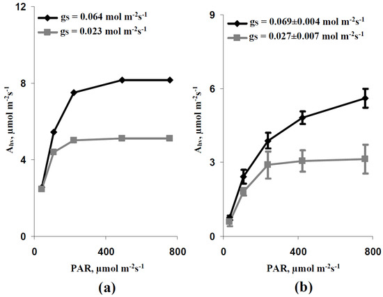 Experimental plants were ranged in accordance with their gS and were divided into two groups with high and low CO2 conductance (average gS in leaves was 0.069 ± 0.004 and 0.027 ± 0.007 mol m−2s−1, respectively, see Section 5.1). It is shown (Figure 2b) that experimental Ahv dependences on light intensity were similar to simulated ones: (i) there were stages of increase in the photosynthetic CO2 assimilation rate and stage of Ahv light saturation, (ii) the maximal Ahv was increased with increasing gS, and (iii) the minimal light intensity for the Ahv saturation was increased with increasing stomatal CO2 conductance. It should be additionally noted that the values of the maximal Ahv differed in the experimental and the simulated results. This moderate quantitative difference could be caused by the used standard values of the model parameters, which were not adapted for pea seedlings (see Section 2).