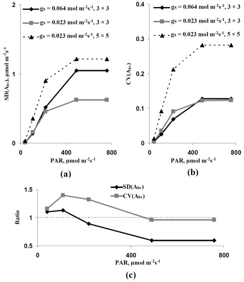 Dependences of parameters of the simulated spatial heterogeneity of the photosynthetic CO2 assimilation rate (Ahv) on the intensity of the photosynthetic active radiation (PAR). (a) Dependence of the standard deviation of Ahv (SD(Ahv)) on the PAR intensity. There were three variants of parameters. (i) The average gS of the leaf was 0.064 mol m−2s−1, each stomata was located in the center of the 3 × 3 elements square. This variant was assumed as the control. (ii) The average gS of the leaf was decreased to 0.023 mol m−2s−1. The CO2 conductance in individual stomata was decreased; each stomata was located in the center of the 3 × 3 elements square. (iii) The average gS of the leaf was decreased to 0.023 mol m−2s−1. The CO2 conductance in individual stomata was not changed; each stomata was located in the center of the 5 × 5 elements square. (b) Dependence of the coefficient of variation of Ahv (CV(Ahv)) on the PAR intensity. (c) Dependence of the ratio of the SD(Ahv) at gS = 0.023 mol m−2s−1 (3 × 3 elements) to the SD(Ahv) at gS = 0.064 mol m−2s−1 (3 × 3 elements) on the PAR intensity and the analogical dependence for CV(Ahv).