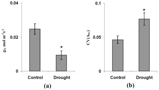 Finally, we experimentally checked the increase in CV(Ahv) at the decreased average gS that was predicted by the developed model. It is shown that the short-term drought (1 day) decreased the gS in pea leaves (Figure 6a), which was probably related to the stomata closing. CV(Ahv), calculated based on the variation coefficient of LEF, was significantly increased during the short-term drought (Figure 6b). This result experimentally supported the increase in photosynthetic spatial heterogeneity due to the stomata closing.