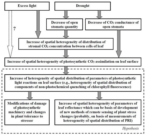 A scheme of potential ways the excess light and drought influencing the heterogeneity of the spatial distribution of photosynthetic parameters and the hypothetical importance of this heterogeneity for the plant tolerance and remote sensing of plant stress changes. The scheme is based on analysis of the developed model and experimental results (see Section 4 for details).
