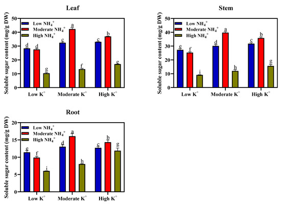 Soluble sugar concentration in leaves, stems, and roots (mg/g DW) of tobacco seedlings under different NH4+ and K+ levels. Different letters indicate significant differences between means ± SD at the p < 0.05 level (n = 9).