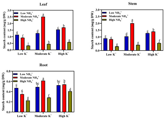 Starch contents of leaves, stems, and roots (mg/g DW) of tobacco seedlings under different NH4+ and K+ levels. Different letters indicate significant differences between means ± SD at the p < 0.05 level (n = 9).