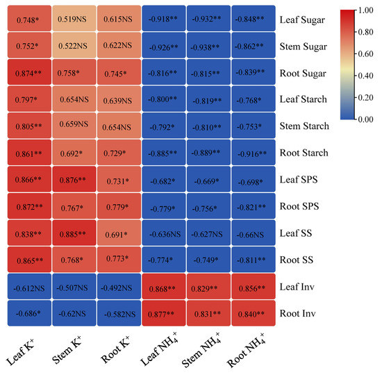 The correlations between sugar-related parameters and ion content (NH4+ and K+) within the plant organs are presented in Figure 3. Leaf K+ content had a significant positive correlation with soluble sugar, starch, SPS, and SS of leaves and roots but was negatively correlated with the invertase activity in the root. However, only the soluble sugar and starch content in the root (p < 0.05), with sugar-related enzyme (except for invertase activity), demonstrated a positive correlation with K+ content in the stem and root. It is worth noting that the NH4+ content in the leaves, stems, and roots were negatively correlated with the soluble sugars (p < 0.01), starch, SPS activities in the leaves and roots, and SS activities in the root. Out of the sugar-related enzymes, only the invertase activity demonstrated a positive correlation (p < 0.01) with the NH4+ content.