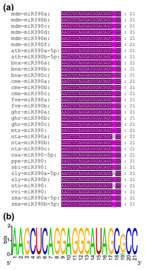 In fifteen species, the predicted miR390s contained two typical sequences produced from the 5′ arm of the MIR390 stem-loop. Most of them have the same sequence (5′-AAGCUCAGGAGGGAUAGCGCC-3′). Six mdm-miR390s also show this conserved sequence, and only three miR390s (nta-miR390a, sly-miR390a-5p, and stu-miR390) are different sequences (Figure 2a). The analysis of miR390 mature sequences’ alignment was visualized by WebLogo. This result showed that mature sequences had high identity, containing 20 bases that were completely conserved (Figure 2b).