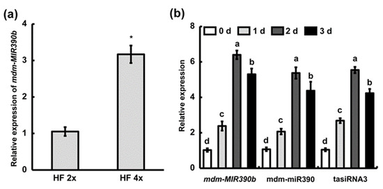 The analysis of the mdm-MIR390b gene, mdm-miR390, and tasiRNA3by qRT-PCR. (a) mdm-MIR390b expression was examined in ‘Hanfu’ and autotetraploid apple. HF 2x represents ‘Hanfu’. HF 4x represents ‘Hanfu’ autotetraploid. The vertical bars represent SDs (n = 3). ‘*’ represents p < 0.05 (Student’s t-test). (b) Expression level of mdm-MIR390b, mdm-miR390, and tasiRNA3 under C. gloeosporioides infection in ‘Hanfu’. The vertical bars represent SDs (n = 3). The different letters represent significant differences at p < 0.05 level.