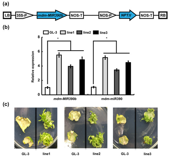 Identification and analysis of transgenic plants. (a) Structural diagram of pRI101-MIR390b. (b) Expression analysis of mdm-MIR390b gene and mdm-miR390 in ‘GL-3′ and MIR390b-overexpressing plants. The vertical bars represent SDs (n = 3). ‘*’ represents p < 0.05 (Student’s t-test). (c) Leaf regeneration observation of ‘GL-3′ and MIR390b-overexpressing plants.