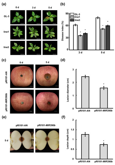 To clarify the function of mdm-MIR390b in C. gloeosporioides resistance, we examined the growth changes in mdm-MIR390b-overexpressing and ‘GL-3′ apple plants under C. gloeosporioides-stressed conditions. After apple plants were sprayed with fungal suspension, discrete small lesions were observed between mdm-MIR390b-overexpressing and ‘GL-3′ apple plants on the third day. Apple MIR390b-line1 and MIR390b-line3 plants displayed weaker disease situations than ‘GL-3′ plants. On the fifth day, larger brown spots were found in the leaves of ‘GL-3′, MIR390b-line1, and MIR390b-line3 plants. The control plants showed more severe disease conditions than overexpressing transgenic apple plants (Figure 5a). Quantitative analysis confirmed that the disease indexes of MIR390b-overexpressing plants were significantly lower than those of ‘GL-3′ plants after C. gloeosporioides treatment (Figure 5b). In apple fruit, the lesion diameter of the control fruit was greater than that of MIR390b-overexpressing plants. The overexpression of mdm-MIR390b inhibited the brown lesions that developed rapidly and the abundant conidia that were produced around the injection site. In contrast, the control apples exhibited more severe disease symptoms (Figure 5c,d). When the fruit were cut through the centers of lesions, V-shaped necrotic tissue areas were also observed. The lesions of control apples were 1.68-fold deeper than those in mdm-MIR390b-overexpressing apples (Figure 5e,f). These results indicate that the overexpression of mdm-MIR390b can enhance the anthracnose resistance of apple leaves and fruit.