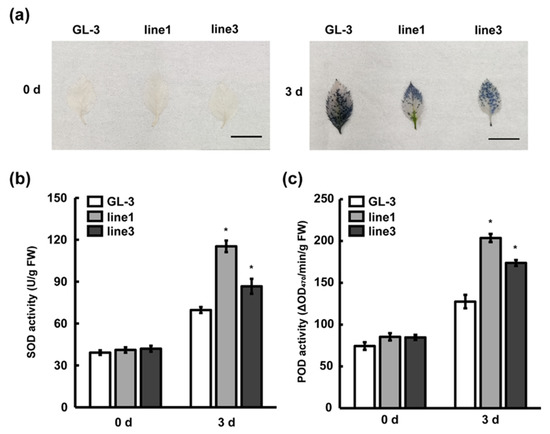 ROS have important roles in pathogen–plant interaction and are involved in hypersensitive responses and signal transduction. To investigate the actions of leaves against C. gloeosporioides infection, O2− was detected in ‘GL-3′ and MIR390b-overexpressing plants by a chemical tissue staining method. Via nitro blue tetrazolium chloride (NBT) staining, more blue precipitations in ‘GL-3′ leaves were observed, indicating a greater level of O2− accumulation than in MIR390b-overexpressing leaves exposed to C. gloeosporioides stress (Figure 6a). SOD catalyzes the conversion of O2− into H2O2 and POD uses H2O2 as an electron acceptor to directly oxidize phenols or amines. They are the first line of defense against oxidative damage and remove excess free radicals in plants and improve the stress resistance of plants. Accordingly, SOD and POD activity was measured in ‘GL-3′ and MIR390b-overexpressing plants. Under normal conditions, there was no significant difference in SOD and POD activity between ‘GL-3′ and MIR390b-overexpressing plants. Under C. gloeosporioides treatment, the antioxidant enzyme activity of all apple plants increased, and compared with ‘GL-3′, the SOD and POD activity of MIR390b-line1 and MIR390b-line3 plants increased at 3 d (Figure 6b,c). In agreement with the results of NBT staining, the O2− content was much higher in the control plants than in MIR390b-overexpressing plants under C. gloeosporioides treatment. These results indicated that MIR390b-overexpressing plants probably achieved enhanced C. gloeosporioides resistance by increasing the activity of antioxidant enzymes in vivo in response to C. gloeosporioides stress.