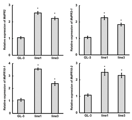 Expression analysis of disease-resistant marker genes in ‘GL-3′ and MIR390b-overexpressing plants. Leaves of 4-week-old ‘GL-3′, MIR390b-line1, and MIR390b-line3 plants were harvested. Expression of PR2, PR3-1, PR10-1, and PR10-2 was measured in control and transgenic apple plants by qRT-PCR. The vertical bars represent SDs (n = 3). ‘*’ represents p < 0.05 (Student’s t-test).