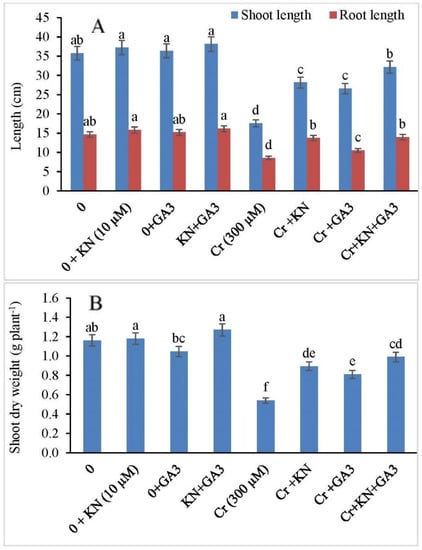 Effect of kinetin (KN) and gibberellic acid (GA3) on (A) shoot and root length, and (B) shoot dry weight in faba bean under Cr toxicity. The letters (a–f) denote significant difference at p < 0.05. Data represent mean ± SE (n = 5).