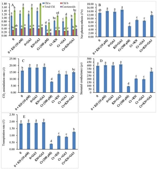 Kinetin (KN) and gibberellic acid (GA3) enhance (A) chlorophyll and carotenoid content (mg g−1 FW), (B) net photosynthesis, Pn (µmol m−2 S−1), (C) CO2 assimilation rate A, (µmol (CO2) m−2 S−1), (D) stomatal conductance (mmol m−2 S−1), and (E) transpiration rate (mmol H2O m−2 S−1) in faba bean under Cr toxicity. The letters (a–e) denote significant difference at p < 0.05. Data represent mean ± SE (n = 5).