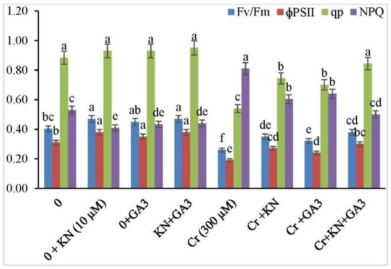 In the absence of Cr treatment, no significant statistical difference was observed in chlorophyll florescence parameters (Figure 3) between faba bean plants not treated with kinetin or GA3, and those supplemented with either kinetin or GA3. Nonetheless, all the attributes related to chlorophyll florescence were significantly reduced under Cr stress. It is pertinent to mention that Cr-treated plants supplemented with kinetin or GA3 alone or in combination (kinetin and GA3) suffered less damage as compared to plants treated with Cr alone. Cr treatment alone decreased the PSII efficiency (Fv/Fm), photochemical efficiency (qp), and quantum yield of PSII (ΦPSII) by 35.00%, 38.63%, and 38.70%, respectively. However, exposure of Cr-treated plants to kinetin and GA3 individually improved all the chlorophyll-florescence-related parameters. Moreover, an increase in the chlorophyll-florescence-related parameters was observed when Cr-treated plants were exposed to the combined application of kinetin and GA3. Additionally, an increase in nonphotochemical quenching (NPQ) was observed in faba bean plants under Cr stress as compared to control plants, and an increase of 52.83% in NPQ was observed under Cr stress. However, the individual application of kinetin and GA3 decreased the NPQ by 25.92% and 20.98%, respectively. The combined application of kinetin and GA3 brought about a greater decrease (38.27%) in the level of NPQ in Cr-treated plants.