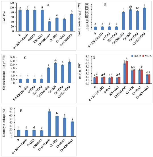 Effect of kinetin (KN) and gibberellic acid (GA3) on (A) RWC, (B) proline content, (C) glycine betaine content, and (D) oxidative stress biomarkers (H2O2 and MDA) and (E) EL in faba bean under Cr toxicity. The letters (a–d) denote significant difference at p < 0.05. Data represent mean ± SE (n = 5).