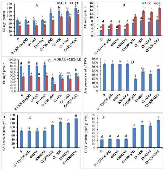 Supplementation of kinetin (KN) and gibberellic acid (GA3) regulates the activity of (A) SOD and CAT, (B) APX and GR, (C) DHAR and MDHAR, (D) AsA content, (E) GSH content, and (F) GSSG content in faba bean under Cr toxicity. The letters (a–d) denote significant difference at p < 0.05. Data represent mean ± SE (n = 5).
