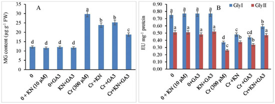 Application of kinetin (KN) and gibberellic acid (GA3) regulates (A) MG content (µmol g−1 FW) and (B) GlyI and GlyII (µmol min−1 mg−1 protein) in faba bean under Cr toxicity. The letters (a–d) denote significant difference at p < 0.05. Data represent mean ± SE (n = 5).