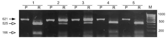 The electrophoretic pattern of separation of PCR fragments of the αCA4 gene of T1 plants before and after treatment with an AspS9I restriction enzyme in 1.5% agarose gel. Designations: 1–5 are the numbers of the corresponding plants; M-DNA marker Step 100 (Biolabmix, Russia), lengths of fragments in bp are indicated on the right; (P)—PCR fragment of the αCA4 gene of the respective plants, and (R)—the result of AspS9I restriction of the corresponding PCR fragment of the αCA4 gene. The black arrow indicates the initial PCR fragment; the white arrows indicate the fragments obtained after AspS9I digestion; the size of the fragments is indicated in bp.
