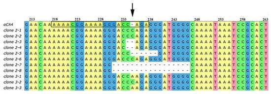 Based on the results of the sequencing of individual clones of PCR fragments of the αCA4 gene from plants 2 and 3, site-specific editing of the αCA4 gene was confirmed. Figure 2 shows the results of the alignment of the DNA sequences of the αCA4 gene in the region of the putative mutation obtained by the cloning of the PCR fragments of the αCA4 gene from plants 2 and 3 with the sequence of the original gene. Among the clones sequenced, we have found six clones carrying an insertion of one nucleotide, nucleotide C in four clones (2-1, 2-2, 2-6 and 3-2) and nucleotide A in two clones (3-1 and 3-3), two clones carrying a deletion of one nucleotide C (2-3 and 2-4), one clone carrying a deletion of five nucleotides (2-5) and two clones carrying a deletion of seventeen nucleotides (2-7 and 2-8). All identified mutations are deletions or insertions leading to a shift in the reading frame of the original gene and, accordingly, to its knockout (Figure 2).