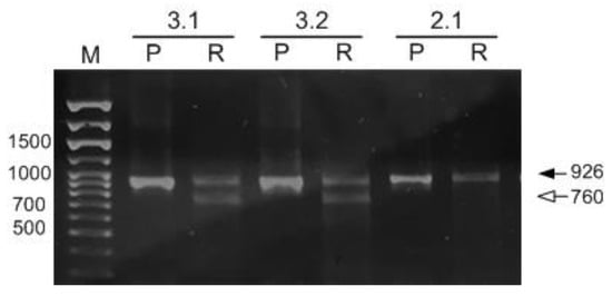 The electrophoretic pattern of separation in 1.5% agarose gel of PCR fragments of the αCA4 gene of T2 plants before and after treatment with AspS9I restriction enzyme. Designations: 3.1, 3.2, 2.1 are the numbers of the respective plants; M-DNA marker Step 100 Long (Biolabmix, Russia), lengths of fragments in bp are indicated on the left; (P)—PCR fragment of the αCA4 gene of the respective plants, and (R)—AspS9I restriction of the corresponding PCR fragments of the αCA4 gene. The black arrow indicates the initial PCR fragment; the white arrow indicates the fragment obtained after AspS9I digestion. Sizes of the fragments are indicated in bp.