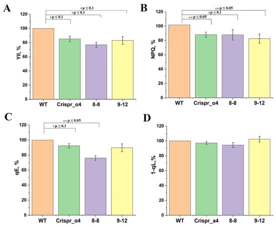 The effect of αCA4 knockout on the quantum yield of PSII, YII (A), total non-photochemical quenching of chlorophyll a fluorescence, NPQ (B), the coefficient of energy dependent component of nPQ, qE (C), and the coefficient 1-qL (D) in intact leaves of the WT Arabidopsis plants and αCA4-KO: Crispr_α4, 8-8 and 9-12. The calculations of the parameters are presented in Section 4. The values were measured in 7 min after illumination with continuous light at a photon flux density of 530 μmol quanta/(m2 s) PAR and at ambient air CO2 concentration. The 100% values were the data for the WT plants: YII of 0.13, NPQ of 1.59, qE of 0.29 and 1-qL of 0.66. Significant differences are denoted as * p ≤ 0.1, ** p ≤ 0.05.