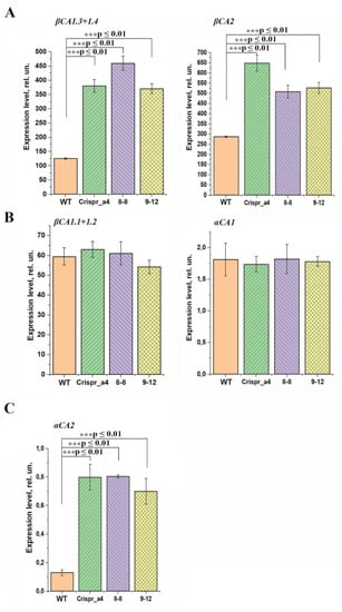 The expression level of the genes encoding cytoplasmic CAs (A): βCA1.3 + βCA1.4 and βCA2; stromal CAs; (B): βCA1.1 + βCA1.2 and αCA1; (C) thylakoid αCA2 in Arabidopsis WT plants and αCA4-KO lines: Crispr_α4, 8-8 and 9-12. Data were normalized for actin gene expression. Values are means ± S.E (n = 3) of three independent experiments. Significant differences were denoted as *** p ≤ 0.01.