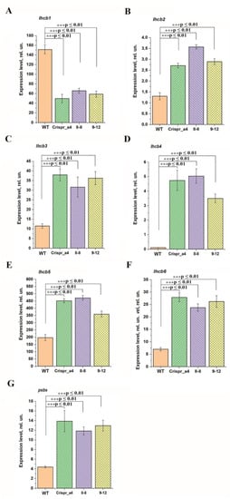 Previously, we have found that the content of the proteins Lhcb1 and Lhcb2 of PSII light harvesting complex (LHCII), as well as the expression level of the genes encoding these proteins, was changed in αCA4-KO if compared with WT plants [7]. In the present study, we show that the expression levels of the genes encoding the proteins of PSII light harvesting antenna, lhcb1, lhcb2, lhcb3, lhcb4, lhcb5, lhcb6 and psbs, were different in αCA4-KO of all three lines if compared with WT. lhcb1 gene expression was three times lower (Figure 6A) and the expression levels of all other genes, encoding proteins of light harvesting antenna, Lhcb2, Lhcb3, Lhcb4, Lhcb5 and Lhcb6, were more than two times higher in all three mutant lines vs. WT (Figure 6B–F). The excess of the level of expression of lhch4 gene in all three αCA4-KO lines was significantly, by two orders of magnitude, higher if compared with the WT (Figure 6D). The expression level of the gene encoding the PsbS protein, which is the main protein inducing the rearrangements in LHC, leading to the development of nPQ, was also higher in αCA4-KO than in the WT (Figure 6G). This correlates with our earlier data on an increase in the content of PsbS in αCA4-KO protein [6].