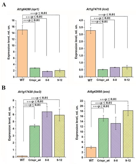 The content of transcripts of the genes inducible by plant immune signals in Arabidopsis WT plants and αCA4-KO lines: Crispr_α4, 8-8 and 9-12. (A) At1g64280 (npr1) and At1g74710 (icsI), induced by salicylic acid; (B) At1g17420 (lox3) and At5g42650 (aos), induced by jasmonic acid. Data were normalized for actin gene expression. Values are means ± S.E. (n = 3) of three independent experiments. Significant differences were denoted as *** p ≤ 0.01.