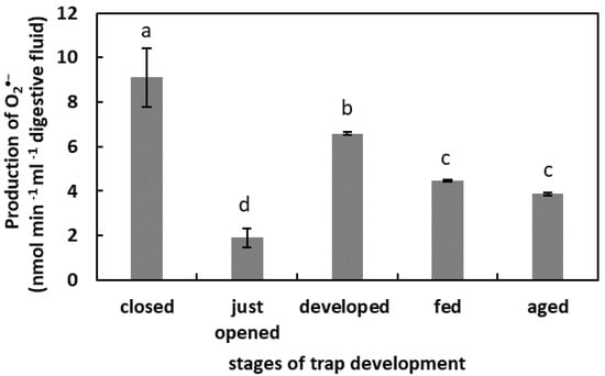 Superoxide anion (O2•−) production in digestive fluid in the traps at different developmental stages: closed, just opened, developed, fed (one day after feeding), and aged. Values are average ± SD of 3 repetitions. Letters (a–d) indicate homogenous groups determined after ANOVA and post hoc Fisher’s LSD test at p ≤ 0.05.