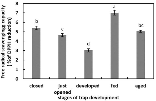In the unfed, developed traps, the total capacity of the free-radical reduction was the lowest. One day after feeding, the total free-radical-scavenging capacity was the highest in the studied model. In the digestive fluid of the closed traps, just-opened traps, and aged traps, the total capacity of the free-radical reduction was at a similar level, of about 5% (Figure 2).
