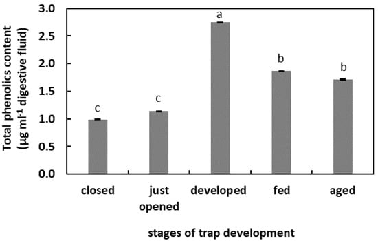 Phenolic compounds (PCs) content in the digestive fluid in the traps at different developmental stages: closed, just opened, developed, fed (one day after feeding), and aged. Values are average ± SD of 3 repetitions. Letters (a–c) indicate homogenous groups determined after ANOVA and post hoc Fisher’s LSD test at p ≤ 0.05.