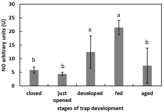 NO generation in digestive fluid in the traps at different developmental stages: closed, just opened, developed, fed (one day after feeding), and aged. Values are average ± SD of 3 repetitions. Letters (a,b) indicate homogenous groups determined after ANOVA and post hoc Fisher’s LSD test at p ≤ 0.05.