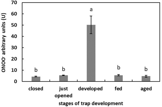 ONOO− generation in digestive fluid in the traps at different developmental stages: closed, just opened, developed, fed (one day after feeding), and aged. Values are average ± SD of 3 repetitions. Letters (a,b) indicate homogenous groups determined after ANOVA and post hoc Fisher’s LSD test at p ≤ 0.05.