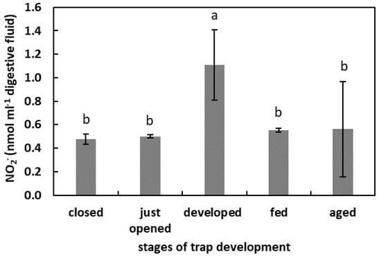 The NO2− concentration in digestive fluid in the traps at the different developmental stages: closed, just opened, developed, fed (one day after feeding), and aged. Values are average ± SD of 3 repetitions. Letters (a,b) indicate homogenous groups determined after ANOVA and post hoc Fisher’s LSD test at p ≤ 0.05.