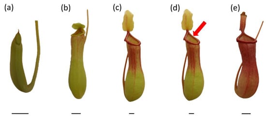 Traps of Nepenthes × ventrata at various stages of development: closed trap (a), just-opened trap (b), fully developed, non-artificially fed trap (c), fully developed trap artificially fed with two fruit flies (Drosophilla melanogaster) or egg-white solution (d), and aged trap (e). Bar = 1 cm.