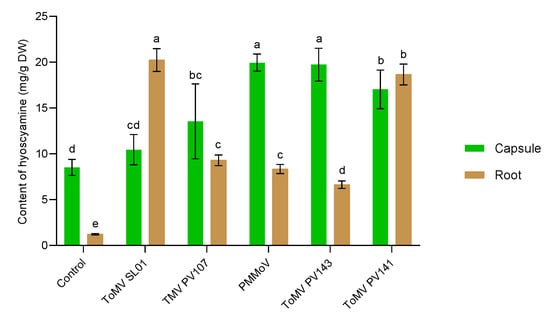 Artificial infections of plants performed in vivo with PMMoV, TMV, and three isolates of ToMV affected differently the biosynthesis of tropane alkaloids and content of analysed hyoscyamine. All three tobamoviruses and their strains, used as biotic elicitors, statistically significantly (p < 0.05) increased content of hyoscyamine in comparison with the control, the non-elicited plants. This was confirmed in the content of hyoscyamine analysed in extracts from capsules, as well as from roots of elicited plants (Figure 1).