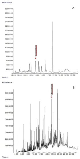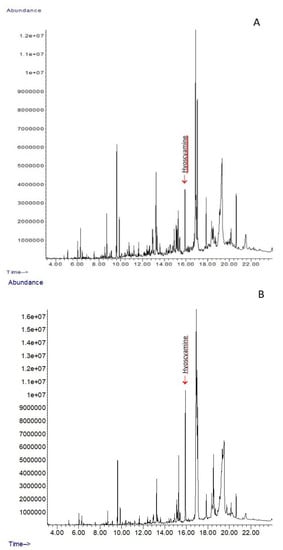 Chromatograms (detector response—abundance vs. retention times in min) obtained from the GC-MS analysis of D. stramonium extracts from capsules. (A) Healthy control plants, (B) Plants elicited with PMMoV. The peak representing hyoscyamine is indicated.