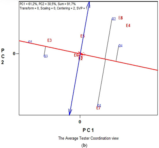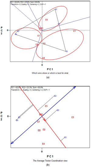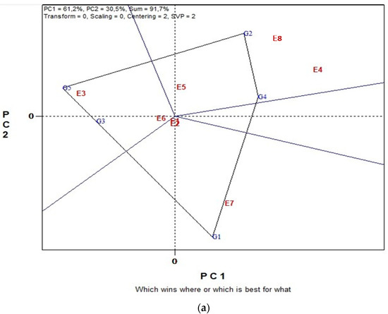 Biplot analysis in organic farming: (a) “which-won-where or which is best for what” view of the GGE biplot based on seed yield of five lentil genotypes in eight environments. Environment 1 and Environment 2 coincide; (b) “discriminating power vs. representativeness” view of the GGE biplot based on yield of five lentil genotypes in eight environments. Environment 1 and Environment 2 coincide.
