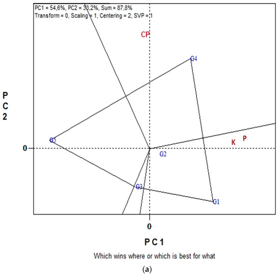 Figure 3a,b displays the GGE biplot graphical analysis of seed P and K macronutrient contents and % seed CP of five lentil genotypes in the eight environments cultivated in organic farming system. Biplot analysis explained 87.8% of total variability in Figure 3a, and 89.6% in Figure 3b. In the “which-won-where” view of Figure 3a, genotypes G4, G5, G3 and G1 are located on the vertices of the polygon performed either the best or the poorest in one or more measurements, i.e., % CP, seed P and seed K contents. The biplot is divided into sectors by the equality lines (sectors of convex hull). Consequently, genotype G4 became the most promising genotype in terms of seed CP since is located on the respective vertex. Similarly, genotype G1 is the most promising in terms of seed P and seed K content since is located on the vertices of the polygon in the sector where seed P and seed K contents are placed. In Figure 3b, the “Average-Environment Axis” (AEA) passes through the average environment and the biplot origin; therefore, a test environment that has a smaller angle with the AEA is more representative of other test environments. Thus, environment E6 is uniquely correlated with seed % CP, and seed K and P contents. Additionally, broad correlated environments with the traits under study were environments E7, E8 and E5, while E1, E2, E3 and E4 presented a low correlated environment. Additionally, environments E8, E6, E5 and E1 were the most discriminating.
