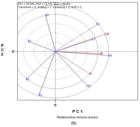 Biplot analysis of seed P, K macronutrient content and seed crude protein (CP) concentration in conventional farming: (a) “which-won-where or which is best for what” view of the GGE biplot based on seed macronutrient P, K contents of five lentil genotypes in eight environments; (b) “discriminating power vs. representativeness” view of the GGE biplot based on seed macronutrient P, K contents of five lentil genotypes in eight environments.